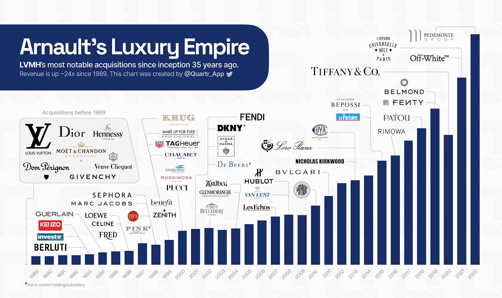 La compañía complementa su crecimiento orgánico con la adquisición de marcas de lujo, habiendo realizado más de 20 adquisiciones desde su fundación, incluyendo marcas conocidas como Tiffany, Dior, Bvlgari y Loro Piana.
